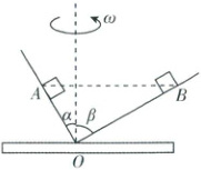 (3)设$A、B$同时不受摩擦力时,对应的高度分别为$h_{A}、h_{B}$,此时转台的角速度为$\omega_{1}$,对$A$有$\frac{mg}{\tan\alpha}=m\omega_{1}^{2}h_{A}\tan\alpha$,解得$h_{A}=\frac{g}{\omega_{1}^{2}\tan^{2}\alpha}$,对$B$有$\frac{m_{B}g}{\tan\beta}=m_{B}\omega_{1}^{2}h_{B}\tan\beta$,解得$h_{B}=\frac{g}{\omega_{1}^{2}\tan^{2}\beta}$,联立解得$\frac{h_{A}}{h_{B}}=\frac{9}{1}$.