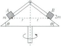 4. (多选)如图,在倾角为$\theta = 37°$的锥体表面上对称地放着可视为质点的$A$、$B$两个物体,用一轻绳跨过固定在顶部的光滑的定滑轮连接在一起,开始时轻绳绷直但无张力。已知$A$、$B$两个物体的质量分别为$m$和$2m$,它们到竖直轴的距离均为$r = 1\ m$,两物体与锥体表面的动摩擦因数均为$\mu = 0.8$,假设最大静摩擦力等于滑动摩擦力,$g = 10\ m/s^2$,$\sin37° = 0.6$,则(