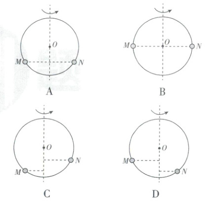 4. [广东领航高中联盟2025高一下联考]某同学设计了一款游戏装置,将两小球$M$、$N$套在光滑的圆圈上,小球$M$的质量大于小球$N$的质量,然后让圆圈绕竖直中心轴匀速转动,稳定后,下列选项中两小球$M$、$N$的位置可能正确的是(