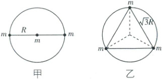 5. [广东深圳外国语学校 2025 高一下期中]宇宙中存在一些离其他恒星较远的、由质量相等的三颗星体组成的三星系统, 可忽略其他星体对三星系统的影响. 稳定的三星系统存在两种基本形式: 一种是三颗星体位于同一直线上, 两颗星体围绕中央星体在同一半径为 $ R $ 的轨道上运行, 如图甲所示, 周期为 $ T_{1} $; 另一种是三颗星体位于边长为 $ \sqrt{3} R $ 的等边三角形的三个顶点上, 并沿等边三角形的外接圆运行, 如图乙所示, 周期为 $ T_{2} $. 若每颗星的质量都相同, 则 $ \frac{T_{1}^{2}}{T_{2}^{2}} $ 的值为 (