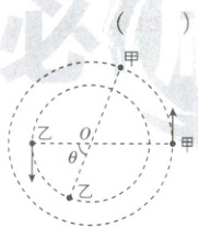 2.A [解析]对双星系统,由相互作用的万有引力充当向心力,有$G\frac{m_甲m_乙}{L^2} = m_甲r_甲\omega^2 = m_乙r_乙\omega^2$,可得$m_甲r_甲 = m_乙r_乙$,即$\frac{r_甲}{r_乙} = \frac{m_乙}{m_甲}$,故甲、乙做圆周运动的半径与两恒星质量成反比,故A正确;由匀速圆周运动的规律可得$v_甲 = \omega r_甲$,$v_乙 = \omega r_乙$,可得$\frac{v_甲}{v_乙} = \frac{r_甲}{r_乙} = \frac{m_乙}{m_甲}$,故甲、乙的线速度大小与两恒星质量成反比,故B错误;双星系统在相等的时间内转过的角度相等,周期相等,由角速度的定义式$\omega = \frac{\theta}{t}$,可得甲的周期$T = \frac{2\pi}{\omega}$,故C错误;由$G\frac{m_甲m_乙}{L^2} = m_乙\omega^2r_乙$,$G\frac{m_甲m_乙}{L^2} = m_甲\omega^2r_甲$,解得$m_甲 + m_乙 = \frac{\omega^2L^3}{G}$,其中$\omega = \frac{\theta}{t}$,可得甲、乙的总质量为$m_甲 + m_乙 = \frac{\theta^2L^3}{Gt^2}$,故D错误.