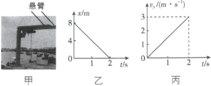 10. [陕西榆林 2025 高一下期中]各种大型的货运站中少不了悬臂式起重机. 如图甲所示,某起重机的悬臂保持不动,可沿悬臂行走的天车有两个功能,一是吊着货物沿竖直方向运动,二是吊着货物沿悬臂水平方向运动. 现天车吊着质量为 $ 100 $ kg 的货物在 $ x $ 方向的位移—时间图像和 $ y $ 方向的速度—时间关系图像如图乙、丙所示,下列说法正确的是(