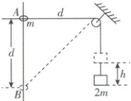 9. [安徽安庆太湖中学 2024 高一下段考]如图所示,将质量为 $ 2m $ 的重物悬挂在轻绳的一端,轻绳的另一端系一质量为 $ m $ 的小环,小环套在竖直固定的光滑直杆上,光滑定滑轮与直杆间的距离为 $ d $. 现将小环从与定滑轮等高的 $ A $ 处由静止释放,当小环沿直杆下滑距离也为 $ d $ 时(图中 $ B $ 处),则(重力加速度为 $ g $ )(