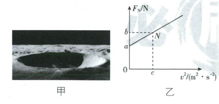 11. (11分)[山东潍坊2025高一下期中]如图甲所示,航天员驾驶月球探测车在半球形陨石坑内进行科学考察,通过车载速度传感器与压力传感器,可测得探测车经过陨石坑最低点时的车速$v$和对地面压力$F_{N}$,根据多次测出的数据得到$F_{N} - v^{2}$图像如图乙所示,图乙中$N$点坐标为$(c,b)$,图线与纵轴交点坐标为$(0,a)$。已知探测车与航天员总质量为$m$,月球半径为$R$,引力常量为$G$,忽略月球自转。求: