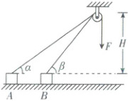 3. 如图所示,在光滑的水平面上,物块在拉力 $ F = 50 \, N $ 作用下从 $ A $ 点运动到 $ B $ 点,不计滑轮的大小、绳和滑轮的质量及绳与滑轮间的摩擦,$ H = 1.2 \, m $,$ \alpha = 37° $,$ \beta = 53° $,$ \sin 37° = 0.6 $,$ \sin 53° = 0.8 $,则拉力
