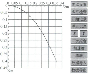 (4) (多选)如图(b)所示为某次实验得到的A抛出后不同时刻的水平、竖直位置坐标,点击计算机软件中的“二次拟合”按钮,绘制得到A做平抛运动时的X-Y关系图像,则
