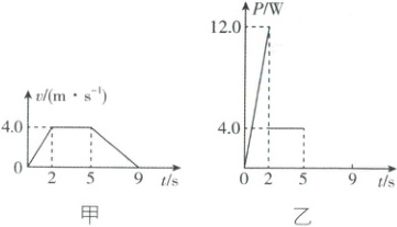 【解析】由$P-t$图像可知,在5~9s内,拉力是零,由牛顿第二定律可得$a = \frac{\mu mg}{m} = \mu g$,由$v-t$图像可知,在5~9s时间内,加速度的大小为$a = \frac{|\Delta v|}{\Delta t} = \frac{4.0}{4} m/s^{2} = 1.0m/s^{2}$,联立解得$\mu = 0.1$,故A正确;由$P-t$图像与时间轴所围成的面积表示拉力做的功,可知物块运动全过程水平拉力所做的功为$W = \frac{1}{2} × 12.0 × 2J + 4.0 × 3J = 24J$,故B正确;由$v-t$图像可知,物块在0~2s内做匀加速运动,当$t_{1} = 2s$时,$v_{1} = 4.0m/s$,又$P_{1} = 12.0W$,由$P = Fv_{1}$可得$F = \frac{P_{1}}{v_{1}} = \frac{12.0}{4.0} N = 3N$,故C错误;在2~5s内物块做匀速运动,根据平衡条件有$F_{1} = \mu mg$,又$P = F_{1} v_{1}$,由题图可知$P = 4.0W$,$v_{1} = 4.0m/s$,联立解得$m = 1kg$,故D正确.