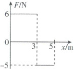 【解析】通过计算$F-x$图像中图线与横轴围成图形的面积可知,全过程中外力做的功$W = 6 × 3J + (-5) × 2J = 8J$,A错误;物体匀加速运动过程的加速度大小为$a_{1} = \frac{F_{1}}{m} = 6m/s^{2}$,匀减速运动过程的加速度大小为$a_{2} = \frac{|F_{2}|}{m} = 5m/s^{2}$,由$2a_{1} x_{1} = v^{2}$,$v^{2} - v_{2}^{2} = -2a_{2} (x_{2} - x_{1})$可得$x_{1} = 3m$处物体的速度为$v_{1} = 6m/s$,由$v_{2}^{2} - v_{1}^{2} = -2a_{2} (x_{2} - x_{1})$可得$x_{2} = 5m$处物体的速度为$v_{2} = 4m/s$,设匀加速和匀减速所用的时间分别为$t_{1}$和$t_{2}$,则$a_{1} t_{1} = v_{1}$,$v_{1} - a_{2} t_{2} = v_{2}$,解得$t_{1} = 1s$,$t_{2} = 0.4s$,故物体运动的总时间为$t = t_{1} + t_{2} = 1.4s$,B错误;全过程中外力做功的平均功率为$P = \frac{W}{t} = \frac{8}{1.4} W \approx 5.7W$,C正确;物体运动到$x = 5m$处时,克服外力做功的瞬时功率为$P = |F_{2}| v_{2} = 20W$,D错误.