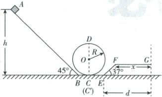 5.D [解析]过山车恰好经过D点,由重力提供向心力可得$m g = m \frac{v_{D}^{2}}{R}$,解得$v_{D} = 10$m/s,从A到D,由动能定理有$m g h - \mu m g \cos 45^{\circ} · \frac{h}{\sin 45^{\circ}} - m g · 2R = \frac{1}{2} m v_{D}^{2}$,代入数据可得$h = 50$m,故A、B错误;过山车从A到G,由动能定理可得$m g h - \mu m g \cos 45^{\circ} · \frac{h}{\sin 45^{\circ}} - \mu m g x - m g l \sin 37^{\circ} = 0$,又$l \cos 37^{\circ} + x = d$,联立可得$x = 40$m,$l = 25$m,故C错误,D正确。