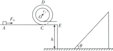 7. [四川内江 2025 高一下期末]如图所示,有粗糙的水平轨道$AC$,长$L = 2.5m$,与一半径为$r = 0.6m$内壁光滑细圆管$CD$平滑连接,末段细管$CE$为水平.现有一质量为$m = 0.2kg$的小滑块,在$F_0 = 2N$的水平拉力作用下从$A$点由静止开始运动,到达$C$时撤去$F_0$,然后,依次经过轨道$CDE$,最后小滑块从$E$点水平抛出垂直打在斜面上.已知小滑块与$AC$之间动摩擦因数$\mu = 0.5$,$E$点距地面高度$h = 2.4m$,斜面倾角$\theta = 45^{\circ}$,忽略空气阻力,重力加速度$g = 10m/s^2$.求: