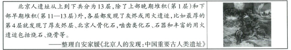 (1)证据:多层都发现了灰烬或用火遗迹;第4层发现了厚灰烬层、用火遗迹包括烧石、烧骨等。(2分)重要意义:火的使用增强了人类适应大自然的能力,是人类进化过程中的重大进步。(2分)