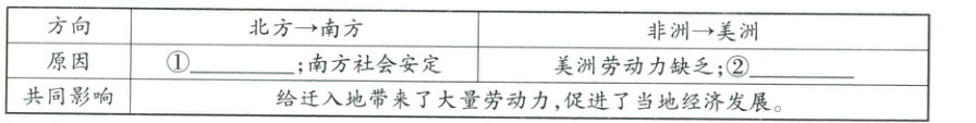 A. ①北方天气变冷 ②美洲大陆吸引移民