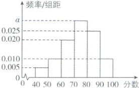 ∴a = 0.030.成绩落在[40,80)内的频率为(0.005 + 0.010 + 0.020 + 0.030)×10 = 0.65 < 0.75,落在[40,90)内的频率为(0.005 + 0.010 + 0.020 + 0.030 + 0.025)×10 = 0.9 > 0.75,