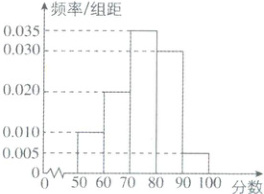 4. 110 【解析】根据题中频率分布直方图,得该组数据的平均数$\bar{x}=55 × 0.010 × 10+65 × 0.020 × 10+75 × 0.035 × 10+85 × 0.030 × 10+95 × 0.005 × 10=75,$