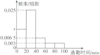 由$20×(x + 0.025 + 0.0065 + 0.003 + 0.003)=1$,得$x = 0.0125$.因为$0.0125×20 = 0.25$,所以该地通勤时长不超过20min的人数约占25%,B正确;