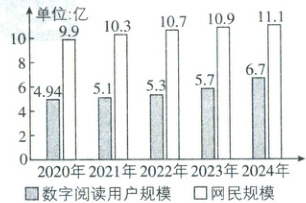 10.ABC 【解析】对于A,根据条形图,知2024年我国数字阅读用户规模为6.7亿,网民规模为11.1亿,所以数字阅读用户规模约占网民规模的$6.7÷11.1×100\%≈60.36\%$,故A正确;对于B,近五年我国数字阅读用户规模的增长量为$6.7 - 4.94 = 1.76$亿,网民规模的增长量为$11.1 - 9.9 = 1.2$亿,所以数字阅读用户规模的增长量大于网民规模的增长量,故B正确;对于C,根据条形图可以看出,从2020年至2024年,我国数字阅读用户规模逐年递增,故C正确;对于D,根据条形图,知从2020年至2021年我国网民规模的增长率为$\frac{10.3 - 9.9}{9.9}≈0.0404$,从2023年至2024年我国网民规模的增长率为$\frac{11.1 - 10.9}{10.9}≈0.0183$,增长率减小了,故D错误。(巧思:在已知网民规模逐年递增的前提下,若增长量减小,则增长率一定减小)故选ABC。