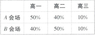 15. (本小题满分13分)[云南昆明2025高一月考]某校高中年级举办科技节活动,开设$A,B$两个会场,其中每个同学只能去一个会场,且25%的同学去$A$会场,剩下的同学去$B$会场. 已知$A,B$会场学生年级及比例情况如下表所示: