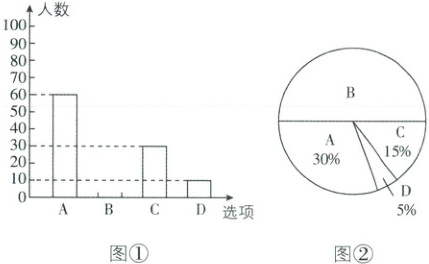 (1)由题图可知,选A共60人,占总人数的百分比为30%,所以总人数为$60÷30\% = 200$,即本次一共调查了200名学生。
