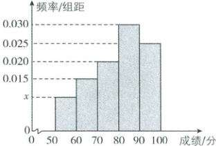 (1)由题意得$(x + 0.015 + 0.020 + 0.030 + 0.025)×10 = 1$,解得$x = 0.010$。