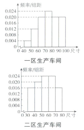 (1)一区生产车间生产的零件尺寸大于60的频率为$(0..020 + 0.024 + 0.020 + 0.020)×10 = 0.84$,则该工厂一区生产车间生产的500个该种型号的零件用于大型机器中的零件个数为$500×0.84 = 420$。二区生产车间生产的零件尺寸大于60的频率为$(0.024 + 0.016)×10 = 0.4$,则该工厂二区生产车间生产的500个该种型号的零件用于大型机器中的零件个数为$500×0.4 = 200$。