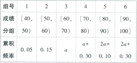 1.65【解析】由第6组累积频率为1得,$2a + 0.3 = 1$,则$a = 0.35$。由$\frac{150}{200}=0.75$知,面试的最低分数线为笔试成绩从低到高排列的$25\%$分位数$m$,由题表知,笔试成绩在$[40,60)$与$[40,70)$的累积频率分别为$0.15,0.35$,故$\frac{m - 60}{70 - 60}=\frac{0.25 - 0.15}{0.35 - 0.15}$,解得$m = 65$,从而可估计参加面试的最低分数线为65。