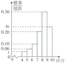 (1)由频率分布直方图可知,评分在$[7,8)$内的频率$f = 1×0.20 = 0.2$,故样本容量$n=\frac{40}{0.2}=200$。由$(t + 0.06 + 0.10 + 0.20 + 6t + 0.36)×1 = 1$,得$t = 0.04$。