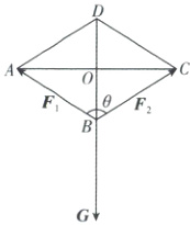 4.AC 【解析】如图,由题知$\theta$的取值范围为$(0,\pi)$,故D错误;因为$|F_1|=|F_2|$,所以平行四边形$ABCD$为菱形,所以$|F_1|·\cos\frac{\theta}{2}=\frac{1}{2}|G|$,即$|F_1|=\frac{|G|}{2\cos\frac{\theta}{2}}$,故A正确;