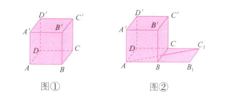 【例 3】 如图①,一只小蚂蚁从吊在天花板上的棱长为 1 的正方体 $ABCD - A'B'C'D'$ 的顶点 $A$ 处,沿其下底面 $ABCD$ 和右侧面 $BCC'B'$ 爬到 $C'$ 处,求小蚂蚁爬行的最短路程。