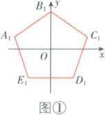 解:依题意,先作出边长为 $1$ cm 的正五边形 $A_1B_1C_1D_1E_1$,同时以过正五边形 $A_1B_1C_1D_1E_1$ 的中心 $O$ 且与 $D_1E_1$ 平行的直线为 $x$ 轴,以 $B_1O$ 所在直线为 $y$ 轴,如图①所示。