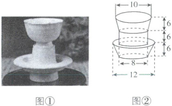 9. [山东聊城一中 2025 调研]图①为宋代的影青瓷花口盏及盏托,我们不妨将该花口盏及盏托看作是两个圆台与一个圆柱的组合体,三个部分的高相同均为 6 cm,上面的花口盏是底面直径分别为 8 cm 和 10 cm 的圆台,下面的盏托由底面直径为 8 cm 的圆柱和底面直径分别为 12 cm 和 8 cm 的圆台组合构成,示意图如图②所示,则该花口盏及盏托构成的组合体的体积为(