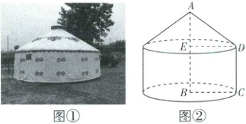(2)圆锥的体积为$\frac{1}{3}· AE·\pi· DE^2 = \frac{1}{3}×2\pi×3^2 = 6\pi$(立方米),圆柱的体积为$\pi· BC^2· CD = \pi×3^2×3 = 27\pi$(立方米),所以该蒙古包的体积为$6\pi + 27\pi = 33\pi$(立方米)。