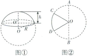 15. [山东济南 2025 高一期中]球面被平面所截得的一部分叫做球冠,截得的圆叫做球冠的底,垂直于截面的直径被截得的一段叫做球冠的高. 球被平面截下的一部分叫做球缺,截面叫做球缺的底面,垂直于截面的直径被截下的线段长叫做球缺的高,球缺是旋转体,可以看作是球冠和其底所在的圆面所围成的几何体. 如图①,一个球面的半径为 $R$,球冠的高是 $h$,球冠的表面积公式是 $S = 2\pi Rh$. 如图②,已知 $C$,$D$ 是以 $AB$ 为直径的圆上的两点,$\angle AOC = \angle BOD = \frac{\pi}{3}$,$S_{扇形 COD} = 6\pi$,则扇形 $COD$ 绕直线 $AB$ 旋转一周形成的几何体的表面积为