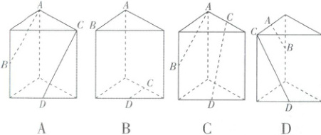 3. (多选)如图,$ A,B,C,D $ 为三棱柱的顶点或所在棱的中点,下列图形中,直线 $ AB $ 与 $ CD $ 是异面直线的为(