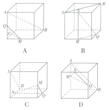 D选项,由正方体结构特征,易得$AB // NQ$,结合线面平行的判定定理,知D不满足题意。