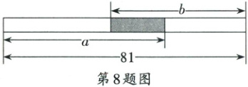 8. (2025·河北)甲、乙两张等宽的长方形纸条,长分别为a,b.如图,将甲纸条的$\frac{1}{3}$与乙纸条的$\frac{2}{5}$叠合在一起,形成长为81的纸条,则$a + b =$