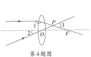 4. (2023·山西)如图,一束平行于主光轴的光线经凸透镜折射后,其折射光线与一束经过光心O的光线相交于点P,点F为焦点.若∠1 = 155°,∠2 = 30°,则∠3的度数为(