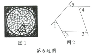 6. (2018·山西)图1是我国古代建筑中的一种窗格,其中冰裂纹图案象征着坚冰出现裂纹并开始消溶,形状无一定规则,代表一种自然和谐美.图2是从图1冰裂纹窗格图案中提取的由五条线段组成的图形,则∠1 + ∠2 + ∠3 + ∠4 + ∠5 =