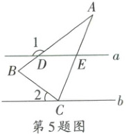 5. (2019·山西)如图,在△ABC中,AB = AC,∠A = 30°,直线a//b,顶点C在直线b上,直线a交AB于点D,交AC于点E,若∠1 = 145°,则∠2的度数是(