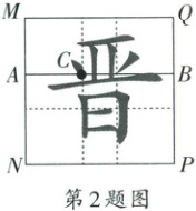 2. (2024·山西)黄金分割是汉字结构最基本的规律.借助如图的正方形习字格书写的汉字“晋”端庄稳重、舒展美观.已知一条分割线的端点A,B分别在习字格的边MN,PQ上,且AB//NP,“晋”字的笔画“、”的位置在AB的黄金分割点C处,且$\frac{BC}{AB}=\frac{\sqrt{5}-1}{2}$,若NP = 2 cm,则BC的长为