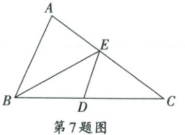 7. 如图,在$\triangle ABC$中,点$D$,$E$分别在边$BC$,$AC$上,$\angle ABE=\angle C$,$DE// AB$,如果$AB = 6$,$AC = 9$,那么$S_{\triangle BDE}:S_{\triangle CDE}$的值是