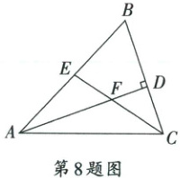 8. 如图,在$\triangle ABC$中,$\angle BAC = 45^{\circ}$,过点$A$作$AD\perp BC$,垂足为$D$,点$F$为$AD$上一点,连接$CF$并延长交$AB$于点$E$,$\angle AFE = 2\angle EAF$,若$AF = 9$,$DF = 3$,则$CF$的长为