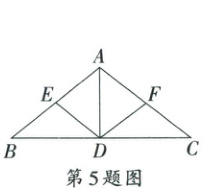 5. (2025·福建)某房梁如图所示,立柱 $AD \perp BC$,$E$,$F$ 分别是斜梁 $AB$,$AC$ 的中点。若 $AB = AC = 8m$,则 $DE$ 的长为