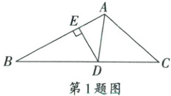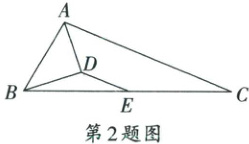 2. 如图,在 $ \triangle ABC $ 中,$ AD $ 平分 $ \angle BAC $,$ E $ 是 $ BC $ 的中点,$ AD \perp BD $,若 $ AC = 7 $,$ AB = 3 $,连接 $ DE $,则 $ DE $ 的长为