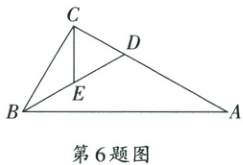 6. 如图,在 $ \triangle ABC $ 中,$ BD $ 平分 $ \angle ABC $ 交 $ AC $ 边于点 $ D $,$ E $ 是 $ BD $ 的中点。若 $ AB = 2BC $,$ AD = 5 $,则 $ CE $ 的长为