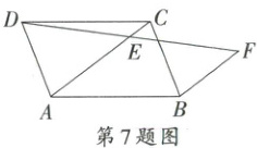 7. 如图,点$E$为$□ ABCD$的对角线$AC$上一点,$AC=5$,$CE=1$,连接$DE$并延长至点$F$,使得$EF=DE$,连接$BF$,则$BF$的长为