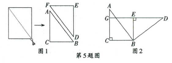 5. (2023·山西22题节选)“综合与实践”课上,老师提出如下问题:将图1中的矩形纸片沿对角线剪开,得到两个全等的三角形纸片,表示为△ABC和△DFE,其中∠ACB = ∠DEF = 90°,∠A = ∠D,将△ABC和△DFE按图2所示方式摆放,其中点B与点F重合(标记为点B). 当∠ABE = ∠A时,延长DE交AC于点G. 试判断四边形BCGE的形状,并说明理由.
