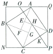 7. 如图,在赵爽弦图中,正方形 $ABCD$ 是由四个全等的直角三角形 $ABF$,$BCG$,$CDH$,$DAE$ 和一个小正方形 $EFGH$ 组成的。若把四个直角三角形分别沿斜边向外翻折,可得正方形 $MNPQ$,连接 $PH$ 并延长,交 $MQ$ 于点 $O$。若正方形 $MNPQ$ 的面积为 $196$,正方形 $EFGH$ 的面积为 $4$。