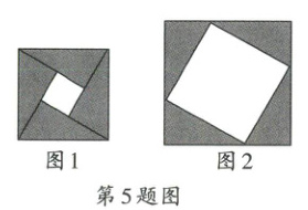 5. 如图,图 $1$ 是北京国际数学家大会的会标,它取材于我国古代数学家赵爽的“弦图”,是由四个全等的直角三角形拼成。若图 $1$ 中大正方形的面积为 $24$,小正方形的面积为 $4$,现将这四个直角三角形拼成图 $2$,则图 $2$ 中大正方形的面积为
