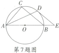7. (2025·适应性训练)如图,$\triangle ABC$内接于$\odot O$,$AB$是$\odot O$的直径,$AD$是$\angle CAB$的平分线,交$\odot O$于点$D$,过点$D$作$\odot O$的切线交$AB$的延长线于点$E$.试判断$DE$与$CB$的位置关系,并说明理由.