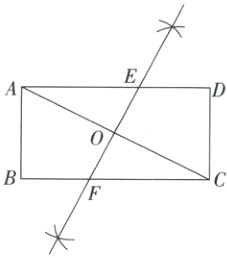 实践与操作:利用尺规作线段$AC$的垂直平分线,垂足为点$O$,交边$AD$于点$E$,交边$BC$于点$F$(要求:尺规作图并保留作图痕迹,不写作法,标明字母).